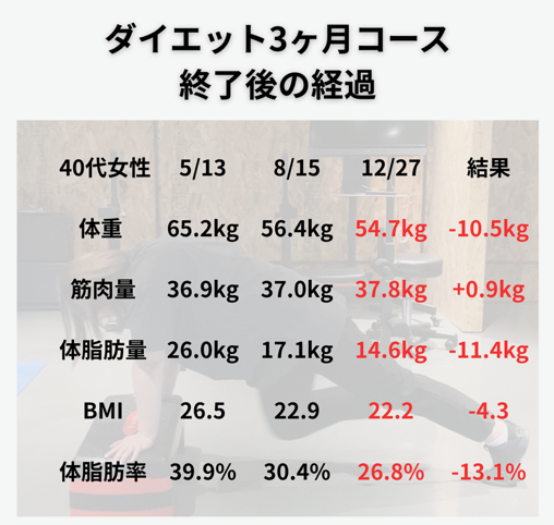 本日は、当ジムのダイエットコースを修了し、その後もご自身の力で進化を続けられている40代女性のお客様の「驚きの成果」をご報告します。