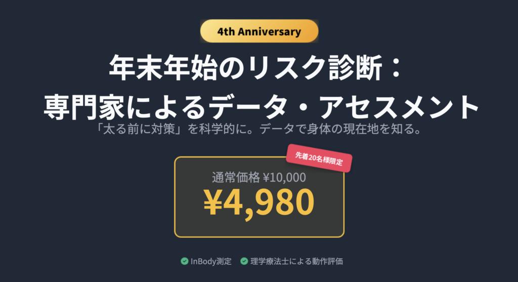 - 目的: 年末年始のリスク(代謝低下、機能不全)を数値で把握し、あなた専用の予防策をご提案します。